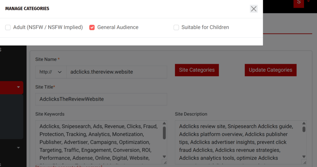 Snipesearch Adclicks requires you to categorize your site appropriately. The categories are:
