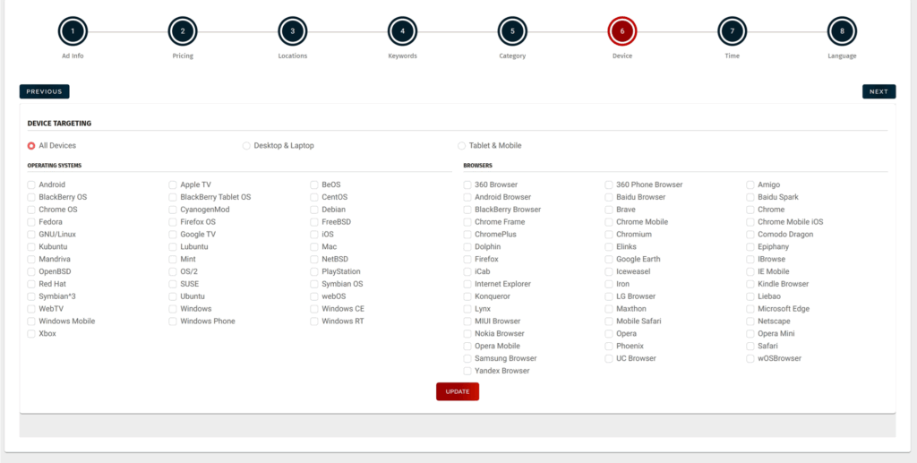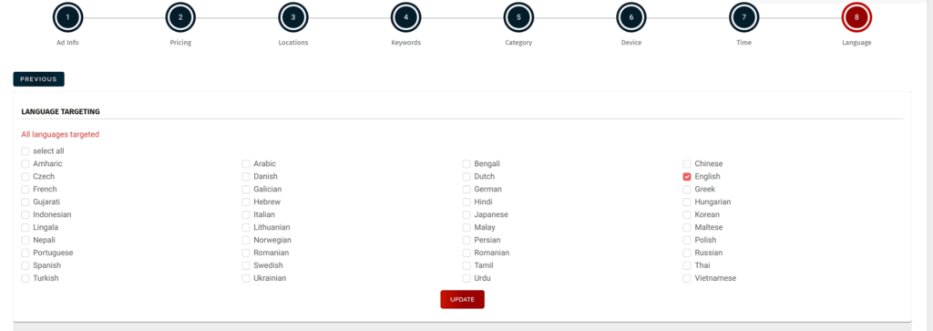 Language targeting ensures your banner only appears where users can understand the message. If your advert and landing page are English-only, selecting English prevents impressions from going to unrelated language environments. If your content supports multiple languages, choose each one that applies. Once you’ve selected your languages, click Update to apply the settings, then click Next to move on.