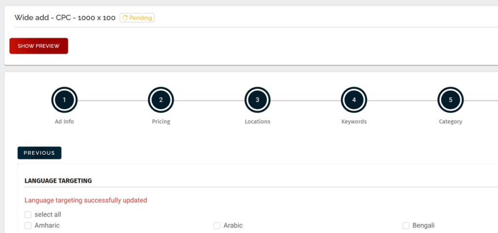 Once you have set your language targeting and clicked Update, the advert setup is complete. The campaign now appears in your Manage Ads list with its status set to pending, and the language screen simply remains available so you can adjust settings at any time. From here you can use the Show Preview button at the top of the page to see how your banner will look, or move back through the numbered steps if you want to tweak pricing, locations, keywords, category or devices. When you are satisfied, you can navigate away to any other section of the advertiser dashboard, knowing the banner and all its targeting choices have been saved.