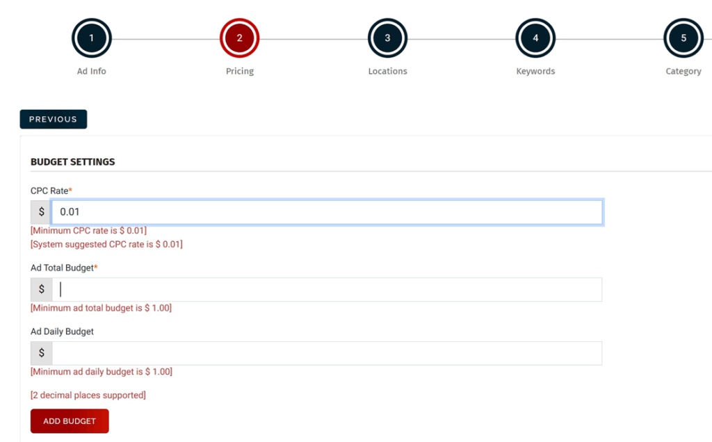 The system now asks for your pricing details. Enter your CPC rate (minimum $0.01), followed by your total budget and daily budget (minimum $1.00 each). Once all values are entered, click Add Budget and then Next to move on. If you do not click add budget first your budget will not be assigned and it will not run.