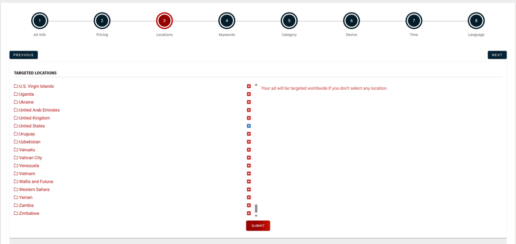 The next screen allows you to limit your advert to specific countries or regions. You can leave everything blank to run globally, or select only the areas you want to reach. When your locations are selected, click Submit to confirm them. Once you have submitted click next, if you do not submit them or if you select none and click next your ads will run globally.