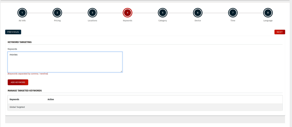 If you want the system to show your advert only on pages containing certain keywords, enter them here. Type your keywords or keyphrases one per line and when your list is complete click add keywords, its recommended if you do want to target to select 50 phrases.. You can also leave this blank to run across the full network. When finished, click Next (make sure you have clicked add keywords if you are targeting specific words or it will Run network wide)