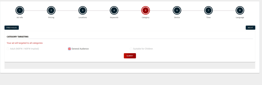 Action: Select Adult, General Audience or Suitable for Children based on both the banner and landing page → Submit → Next.