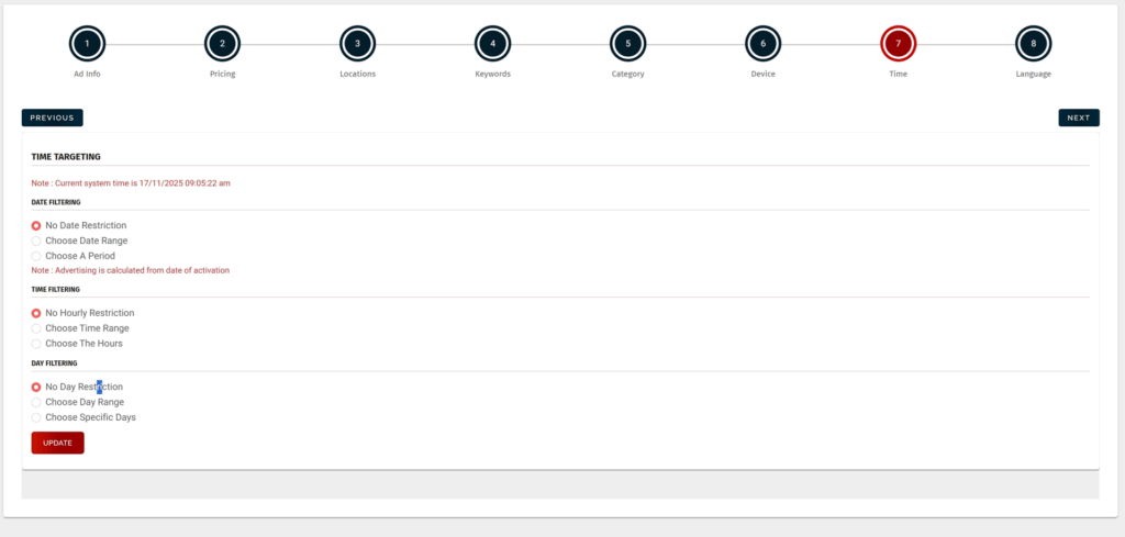 This section determines when your advert is allowed to run. If your campaign performs best at certain times of day, or if your business hours matter, scheduling can prevent wasted impressions and improve results. You can allow the advert to run without limits, or choose specific dates, hours and days that suit your audience. After choosing your timing rules, always click Update so the schedule is actually saved. When the page confirms the update, click Next to continue.