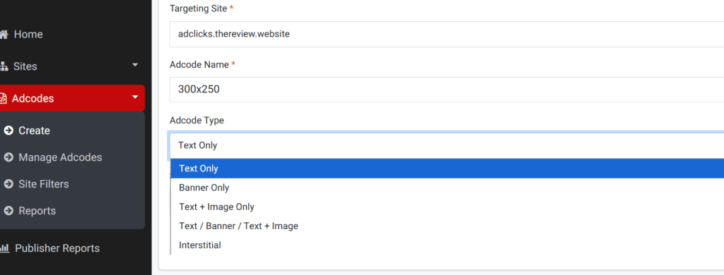 Select the approved site where the ad will be placed. Give your adcode a clear, recognizable name for future reference. Next, choose the ad type: