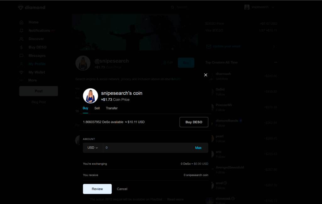 Every Diamond account can launch a CC1 creator coin. This coin is essentially a tradable micro-currency whose price floats with demand. Supporters can buy in to back a creator or publisher, holding coins as a stake in future value. Snipesearch itself has a CC1 coin trading at about $1.73 at the time of publication, showing how even niche publishers can have a live token economy layered onto their social presence.