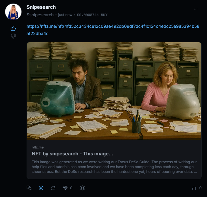 First, Focus itself currently doesn’t have a full-featured NFT marketplace interface (its Focus has been more on posts and tokens). However, the DeSo blockchain supports NFTs as a native feature, and Focus users can mint, post, and discuss NFTs, even if the actual buying/selling might happen via NFTz or another DeSo node.