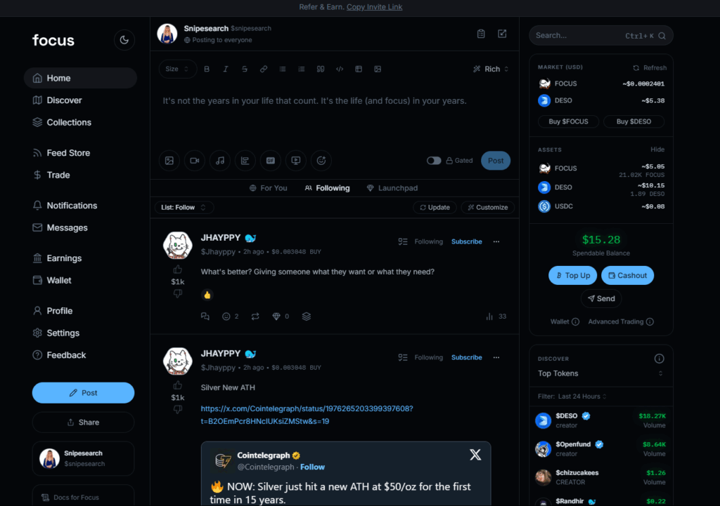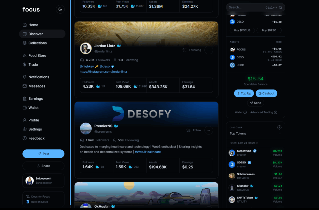 It attracts a certain audience: crypto enthusiasts, investors, and speculators who are constantly seeking interesting new projects and creators to back. These are users who might not have discovered your content elsewhere. On Focus, that finance-savvy crowd could stumble upon your posts (or your token if you have one) and become long-term followers or customers. In essence, Focus’s token ecosystem serves as both a monetization vehicle and a discovery mechanism. If you do launch a token, you might see people promoting it or discussing it, which further spreads your brand on the platform. And thanks to Focus’s integration with the Openfund DEX, all these tokens (including the main $FOCUS token of the platform) are easily tradeable across the DeSo network’s marketplaces.