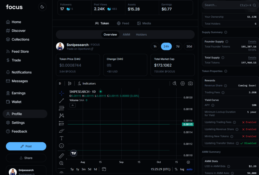 Launching a token on Focus is deliberately made simple. You don’t need to write smart contracts or deal with technical details; Focus uses standardized on-chain profiles for each token. In fact, every token gets its own profile page on Focus, just like a user profile, complete with a unique ticker (no two tokens can have the same handle, solving the problem of copycat coins). You can set a description for your token and even make posts from its profile, sharing updates or engaging with holders. For instance, if you launched $RENEW, you might post announcements about new articles or projects under the token’s profile, and people following the token will see them.