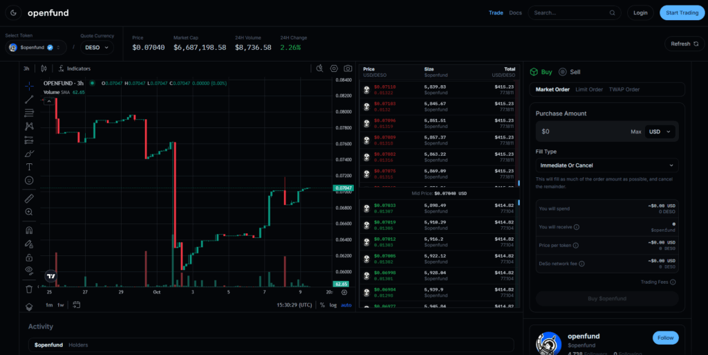In fact, Focus directly uses Openfund for all its token trades – if you click the “Trade” section in Focus, you’re essentially interacting with Openfund ’s order-book through a simplified interface. For power users, Openfund’s own site (or app) provides advanced charts, trading tools, and algorithmic trading options for any DeSo token.