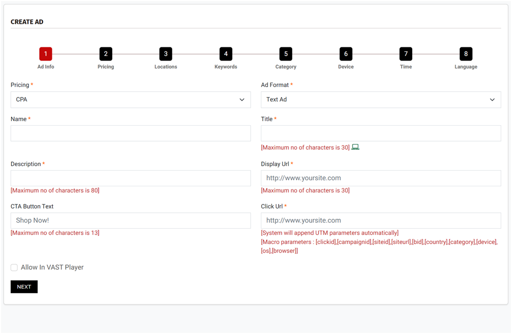 This stage defines the public face of your campaign. The campaign name is for your records only, but it’s best to make it descriptive so you can distinguish it easily later. Titles and descriptions are limited in character length and need to be sharp, clear, and appealing because this is what users see first. The display URL should look clean and trustworthy while the destination click URL must be a working page that matches the promise of your ad. If there’s a mismatch, users will lose trust and conversions will collapse. The CTA button text is your final chance to guide action and should match the tone of your offer. If your campaign is designed for a media site with VAST enabled, remember to allow this setting so your ad can also run in compatible placements.