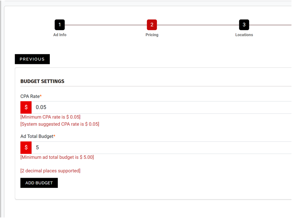 Action: Define your CPA rate, set total budget and daily budget → Add Budget → Next.