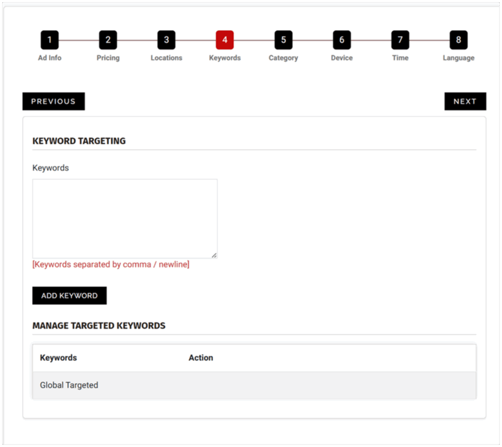 Keywords are the backbone of targeting in text-based CPA campaigns. They dictate when and where your ad appears by aligning with user intent. Without keywords, your campaign defaults to run of network placement, which may generate broad impressions but little meaningful action. With carefully chosen keywords, you match your ads to people actively searching for what you provide. Snipesearch allows between 20 and 250 keywords, which means you can cast a wide net while still remaining specific. Long-tail phrases tend to perform better in CPA because they capture intent more directly. For example, a user searching “download calorie tracker app free” is more likely to convert than someone searching “fitness.” Another common mistake is typing in a list of keywords and moving on without hitting the add keyword button, which means none of them are actually saved.