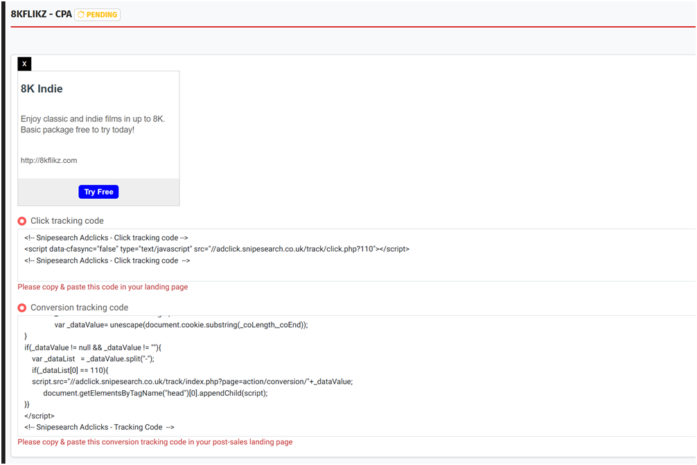 These codes are how the system verifies that your conversions are real. If they are not installed or working correctly, the campaign will be declined at approval or paused later if no conversions are tracked within 30 days despite recorded clicks. It is essential that you or your developer add these snippets within 72 hours of submitting your ad.
