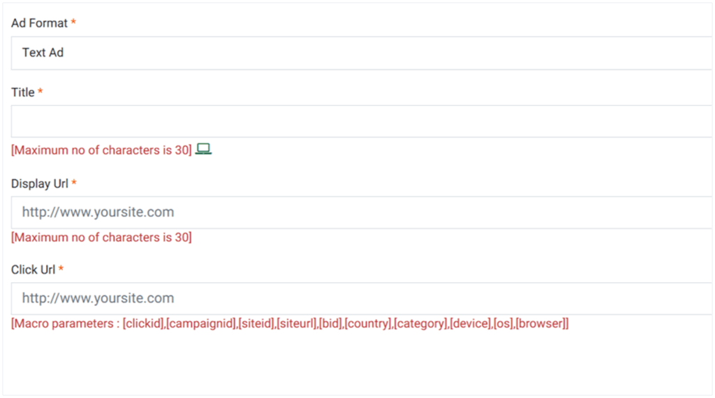 Action: Fill in Name, Title, Description, Display URL, CTA, and Click URL.