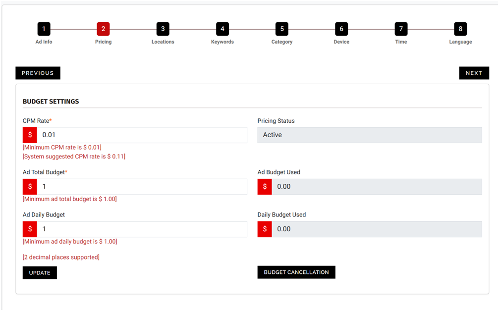 Here’s where you balance costs with reach. Set your CPM rate (minimum $0.01, suggested $0.11), along with both total and daily budgets (minimum $1 each). With CPM, higher rates can increase the speed and priority of impressions, but it’s often better to start small and adjust upward as performance data comes in. Use the “Add Budget” button to save your financial settings. Then click Next to continue.