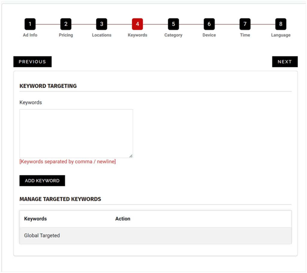 Even though CPM charges per impression, keywords determine where those impressions occur. Without them, your campaign runs on a broad “Run of Network” basis. Adding 20–250 keywords helps align your ads with relevant searches and page content, increasing the likelihood that impressions lead to actions. . Enter 20–250 comma-separated phrases that describe your offer, then click “Add Keyword” and click next to continue, if you dont press the add keyword box, they will not be applied.