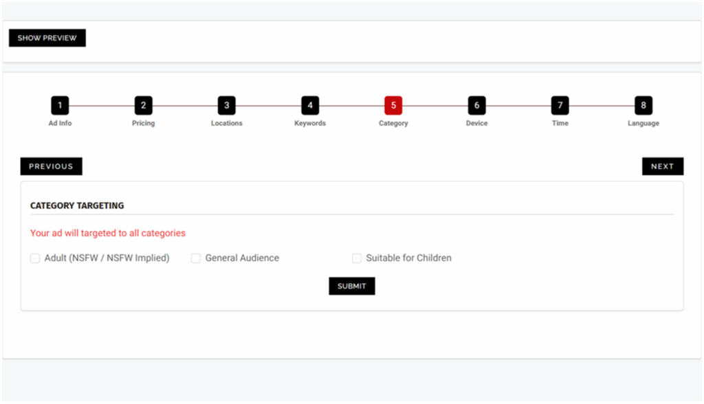 Categories on Snipesearch Adclicks are deliberately simple and strict: you choose one of three options — Adult (NSFW / NSFW Implied), General Audience, or Suitable for Children. That small set exists because category selection must be unambiguous and enforceable during the manual review process. Choosing correctly protects your campaign from being disapproved, prevents misplacement of impressions, and ensures advertisers only appear alongside appropriate content.