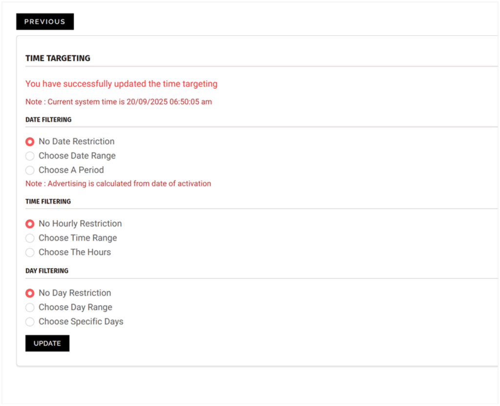 Day Filtering gives you the option to run ads every day, on weekdays only, or even pick specific days. This is perfect for offers tied to weekly events — like a Friday-night promotion or a Monday-only sale.