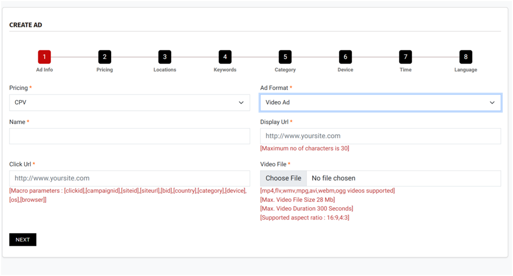 • Click Url*: The destination page users are sent to after engaging with the video. Macros are supported here — [clickid], [campaignid], [siteid], [siteurl], [bid], [country], [category], [device], [os], [browser] — which can be added for advanced tracking.