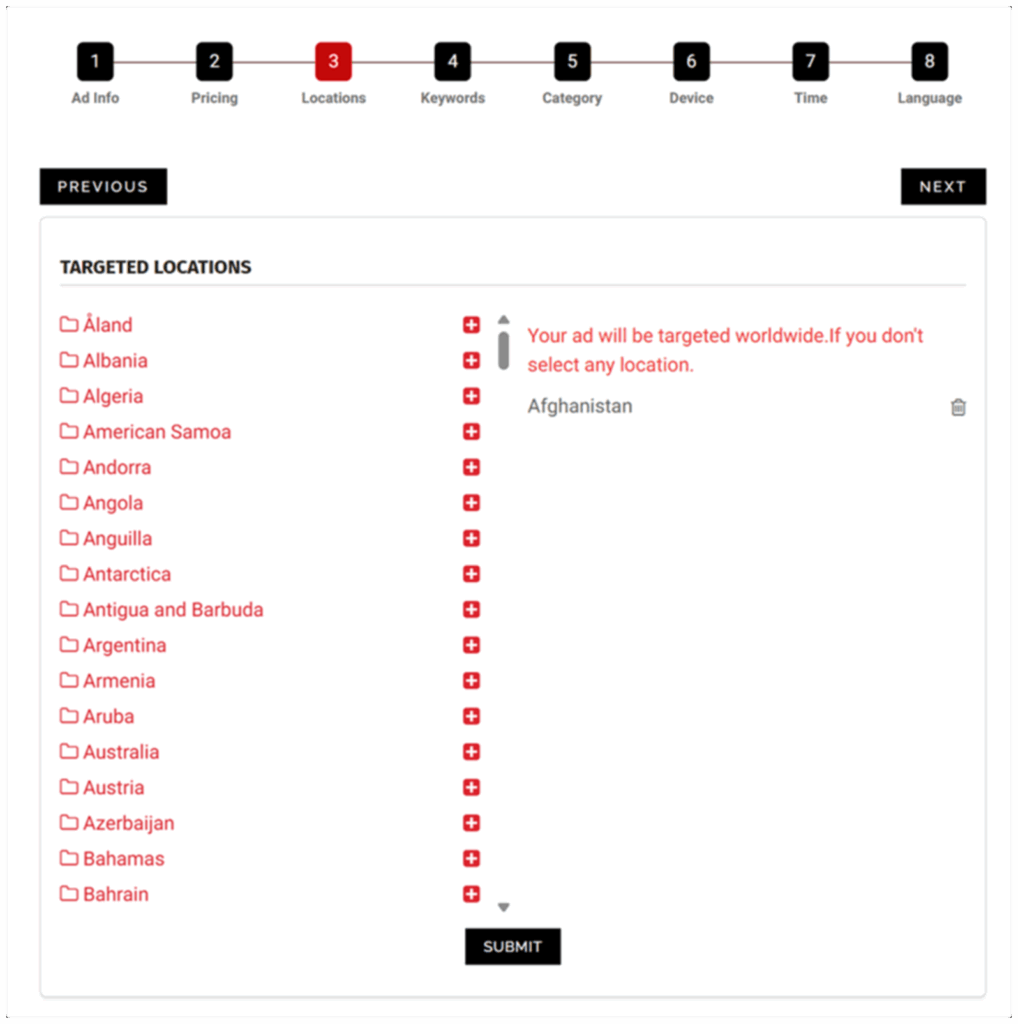 A common mistake is forgetting to click Submit after selecting locations. If you don’t, the system defaults to global targeting — which can drain budget on irrelevant traffic. Always confirm your selections before moving on.