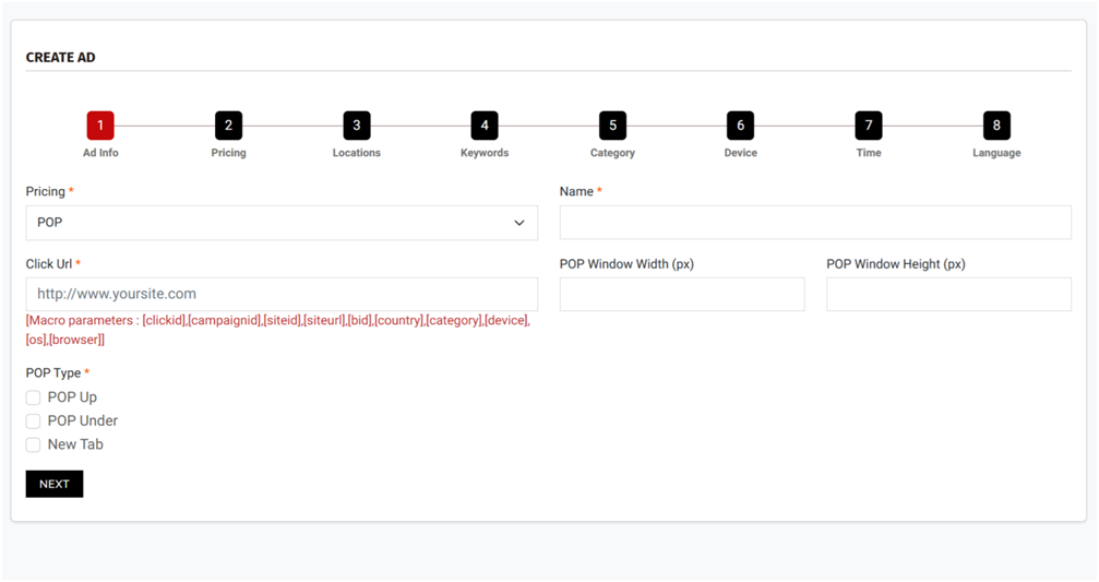 When you select POP, the builder automatically adjusts the campaign to operate under POP rules. This means your ad will be served as a pop-up, pop-under, or new tab depending on the configuration you choose later. All billing will be CPM-based, calculated on impressions delivered.