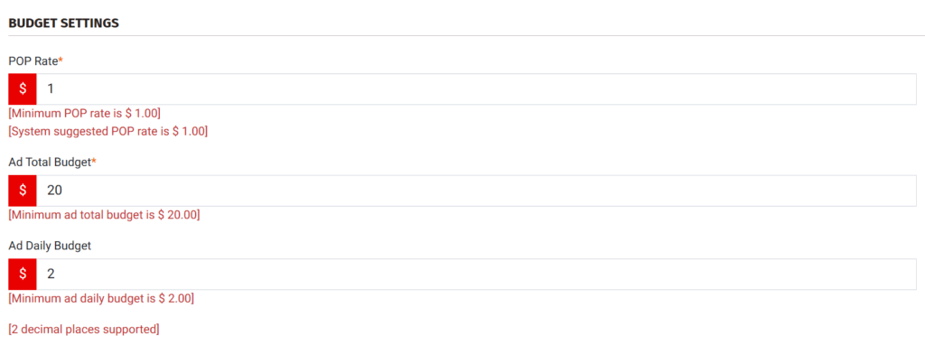 The rate you set determines how competitive your ads will be in the POP auction. While you can choose the minimum, bidding slightly above often helps secure higher-quality placements. The total and daily budgets define the pacing of your spend. For example, if you set a $100 total budget with a $10 daily cap, the system will spread impressions over at least ten days.