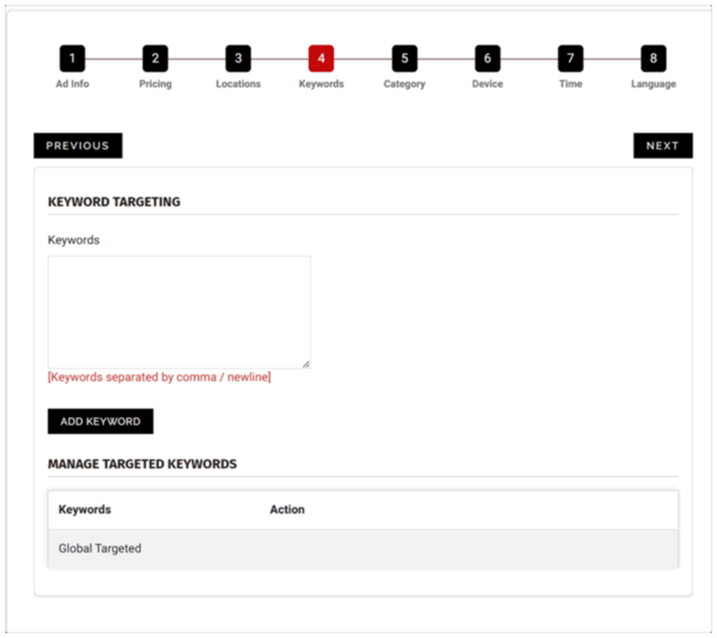 Keyword targeting in POP campaigns works differently than in CPC search ads. Because POP traffic is impression-based, keywords serve as contextual signals rather than direct queries. They help the platform decide when and where to trigger your ad, ensuring better relevance.