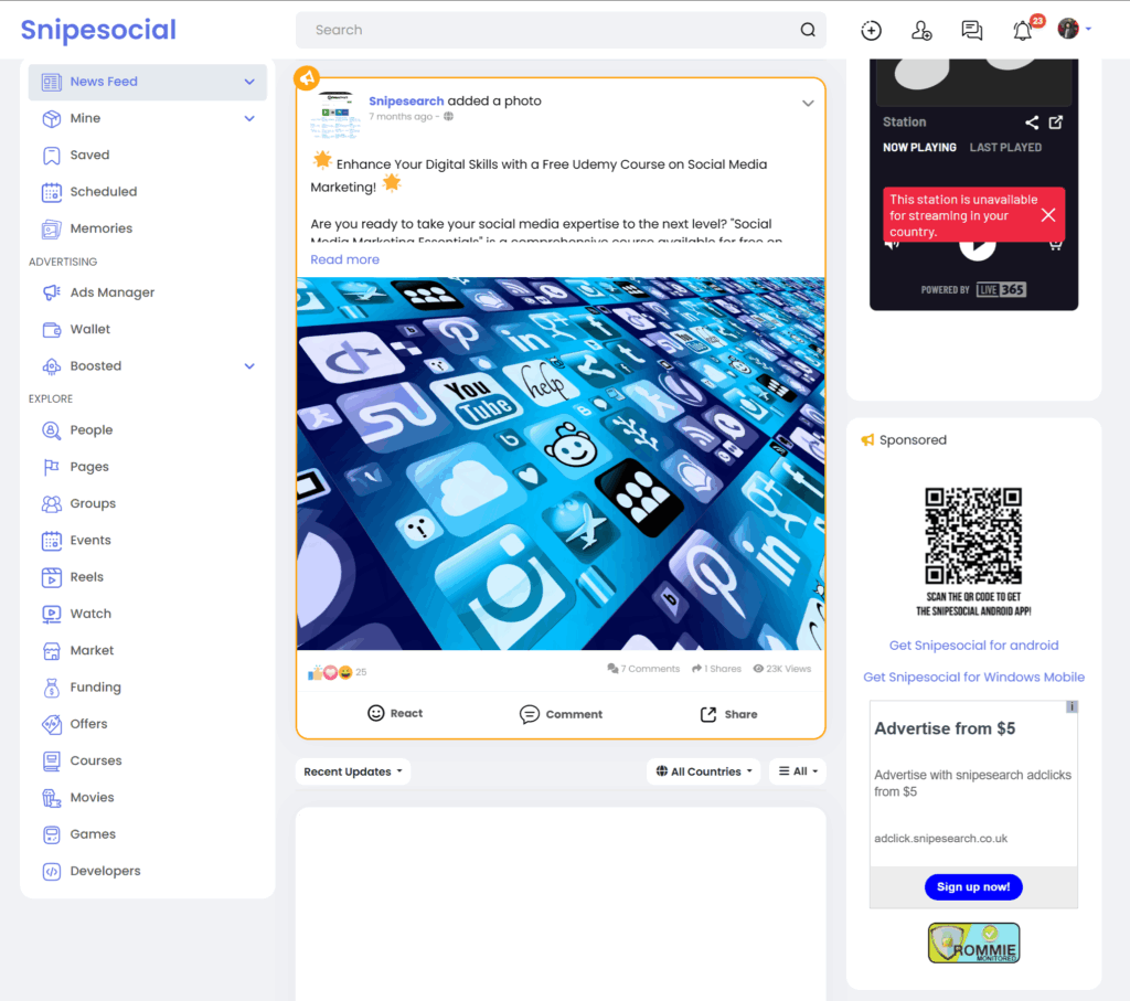 Snipesocial (the social network component of Snipesearch) provides another rich venue for your ads to appear. Users on Snipesocial browse a news feed, visit profile pages, look at photos/videos, and more – and Snipesearch Adclicks delivers ads in several of these areas in a user-friendly way. The goal on social is to introduce ads natively into the experience (often in the form of “sponsored posts” or sidebar banners) without being overly intrusive. Here are the key ad placements across Snipesocial: